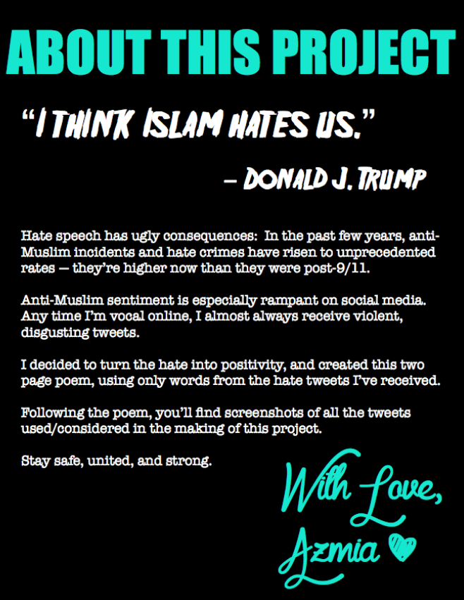 “I decided to turn the hate into positivity, and created this two page poem, using only words from the hate tweets I’ve received. Following the poem, you’ll find screenshots of all the tweets used/considered in the making of this project. Stay safe, united, and strong, with love, Azmia.”
