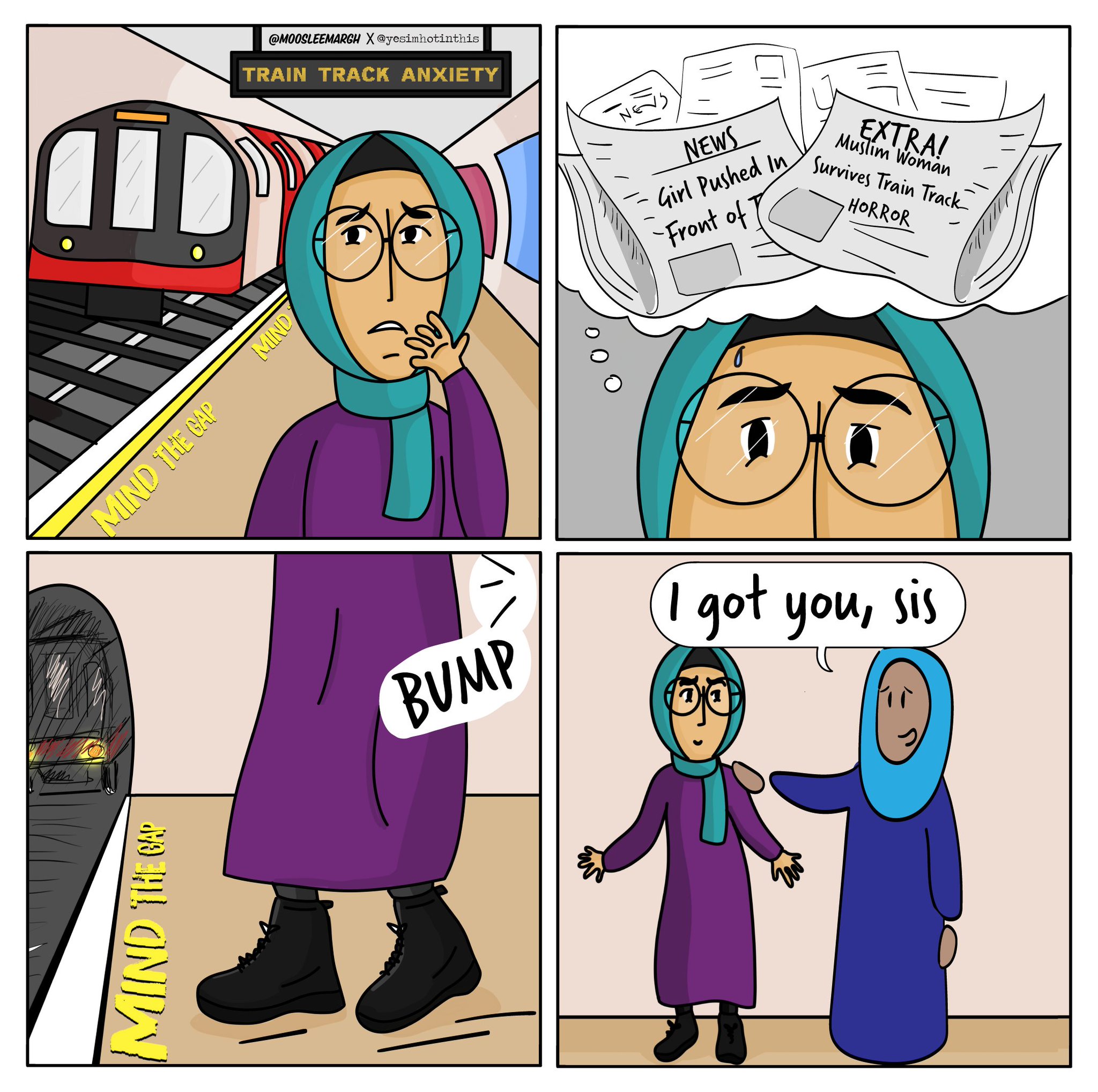@moosleemargh and @yesimhotinthis have come together to illustrate the experience, showing a Muslim woman in worry as a train approaches and being comforted by another sister.