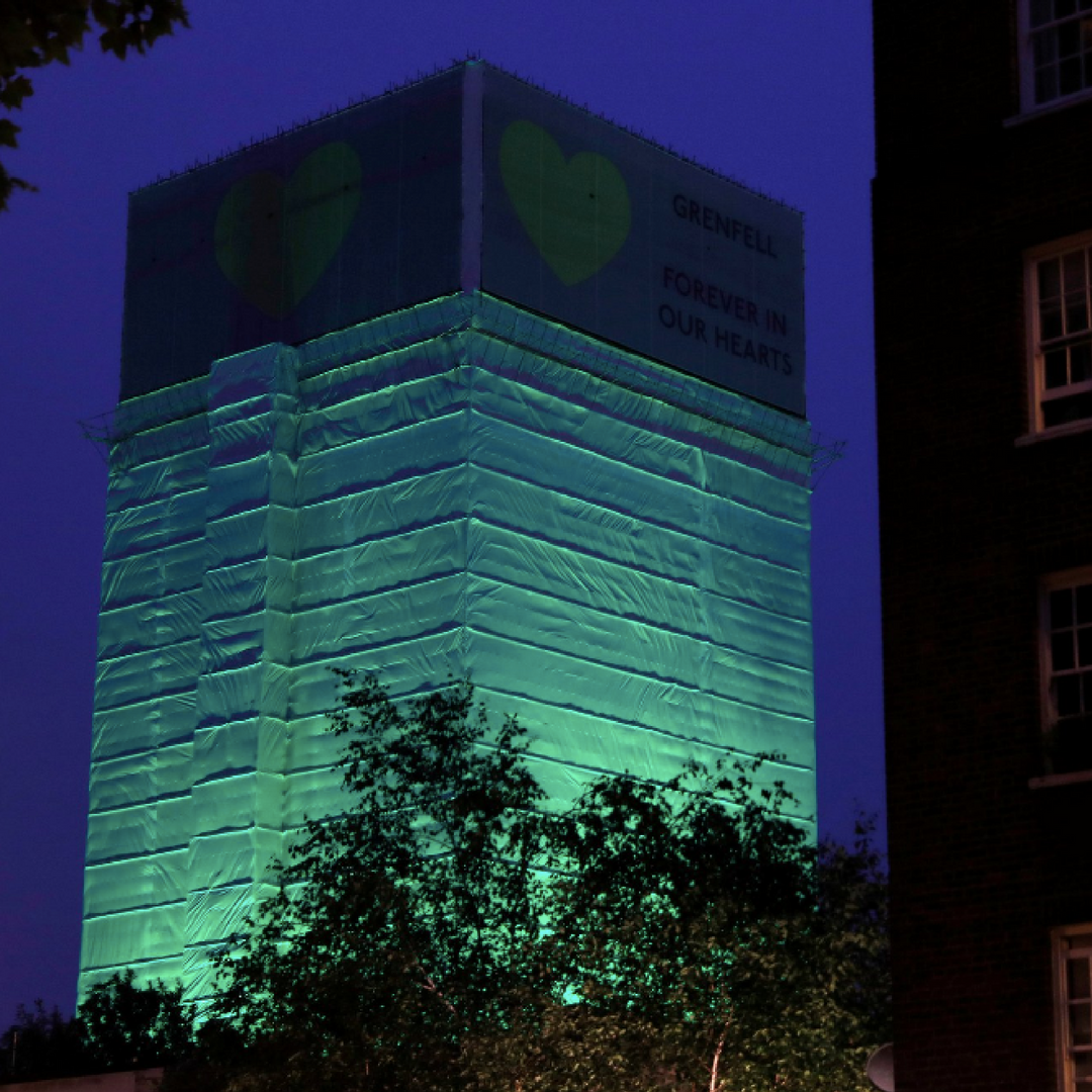 Grenfell Tower, and 12 other London buildings, illuminated green to mark one year since the fire that claimed 72 lives