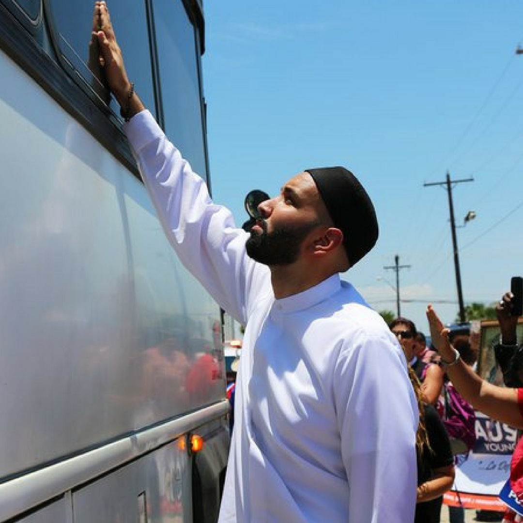 “I have just witnessed the most horrifying thing I’ve ever seen in person. Today, I travelled 11 hours to get to McAllen, Texas. I witnessed a caged police bus transporting children into a repurposed factory where they will be kept. These children were ripped from their mothers and in a foreign land with nothing and no one. I could see those kids crying. The children were too afraid to move. The younger ones made tiny waves back at us and put their hands against the windows while we chanted that they were not alone in Spanish. Once we knew the children were on the bus we flooded the street and stopped the bus from moving. We stood on all sides of the bus. We signed, we waved, we did everything in our power to show those children that we love them and are fighting for them. Imam Omar Suleiman is placing his hand on a child’s hand and praying. If you look closely you can see tiny hands pressed against the tinted windows. I was not prepared to witness any of this. My tears didn’t stop from the moment we realized what was on that bus. I hope those beautiful babies knew we would do anything to give them their family and their freedom. I hope they know we love them. I hope this fuels my heart to do more. I have more to write but I can’t see through my tears. “