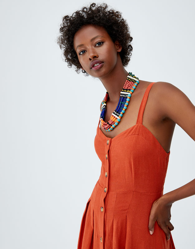 This beautiful orange button down dress oozes summer chic. The brown vintage button down detail has become a key feature on dresses this season. Teamed with a long white under top and skirt, the perfect modest combination. Shop the look!