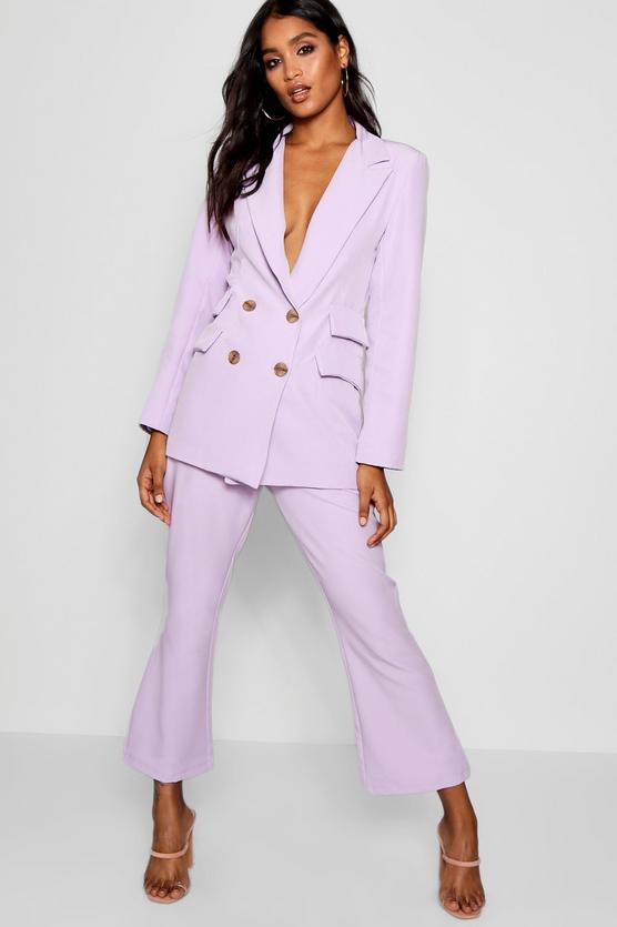 We are all about pretty two-piece matching suit sets. We are loving the kick flare trouser, even more, look how this one is styled with a military double-breasted suit jacket, teamed with a pretty single strap shoe, which creates an elegant fit, with a flattering prolonging effect to your leg. Trousers this season are taking a relaxed, and individual silhouette, designed to set you apart from your peers in the office. Sports tailoring has set the trend with a wide leg at the bottom. Matching block colour suit jacket and trouser separates are completely in this season, go on be daring!