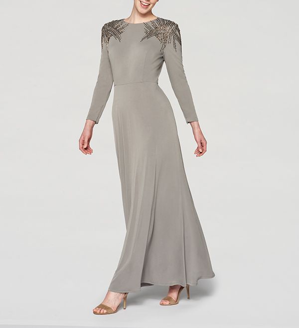 A stunning evening wear gown in Dusty Rose. “This elegant maxi dress featured clusters of jewelled embellishment to the bodice, kimono sleeves and striking pleating to the skirt. Perfect for any special occasion.”