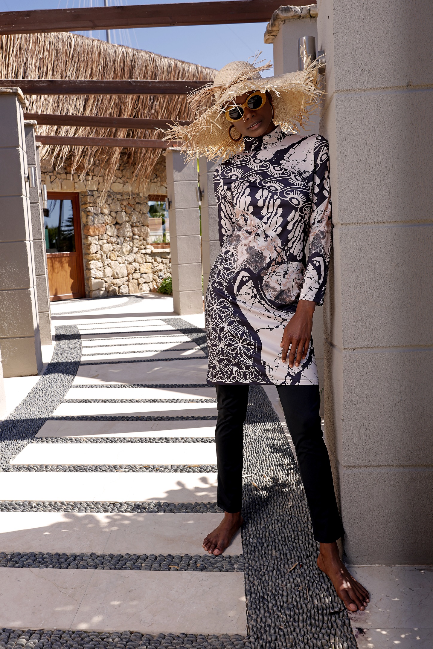 Mayo Bellanavy burkini with white patterns, unlined fully covered (Price: $33). The 3-piece bathing suit has a patterned top, navy bottoms and bonnet, all with water-repellent finishing. Chlorine and saltwater resistant.