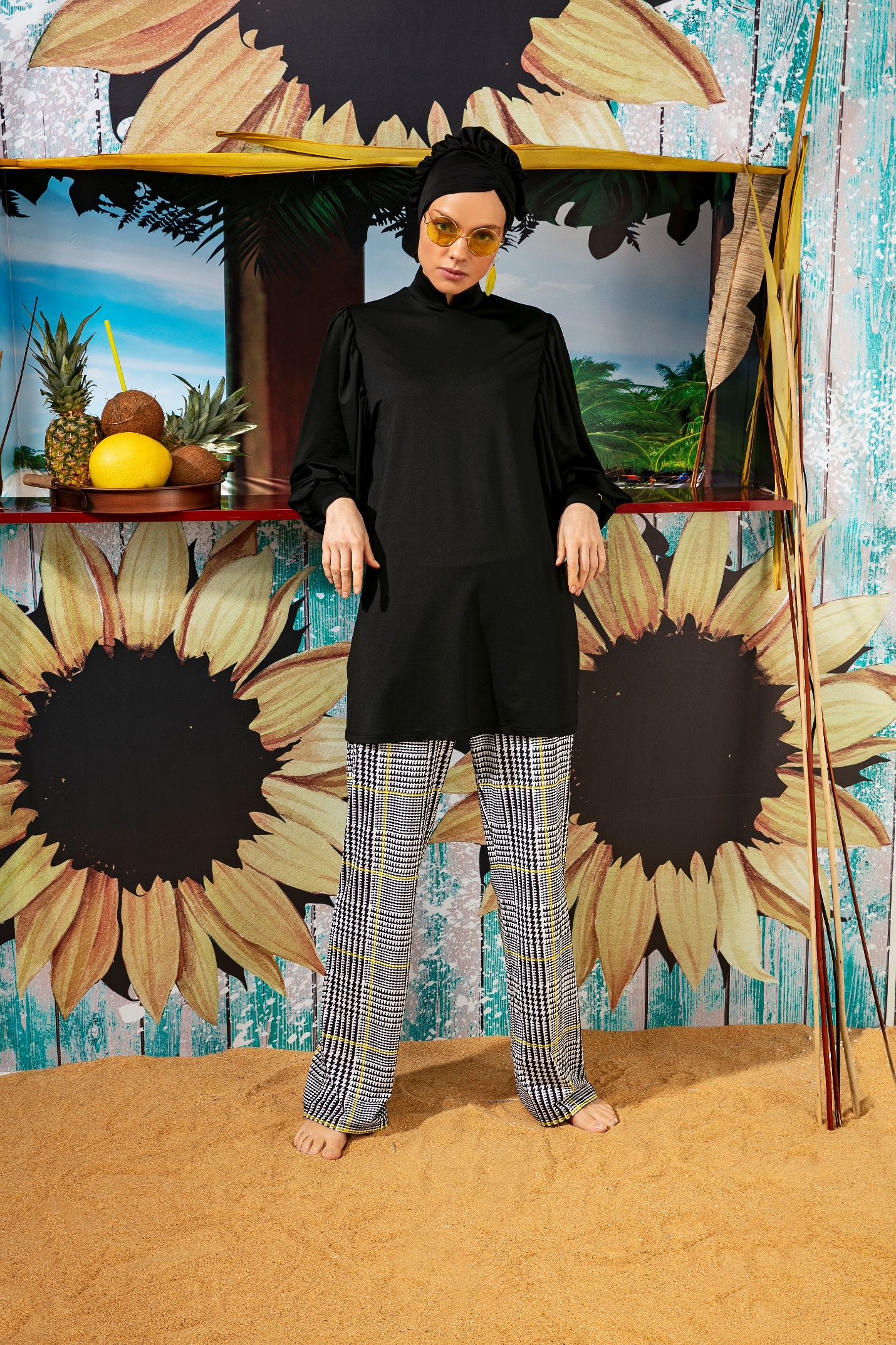 Mayovera burkini, unlined, fully covered (Price: $74.25). The 6-piece bathing suit has a black top, black, yellow & white plaid bottom black bottoms, bonnet, hairband & two pieces of underwear. Chlorine and saltwater resistant.