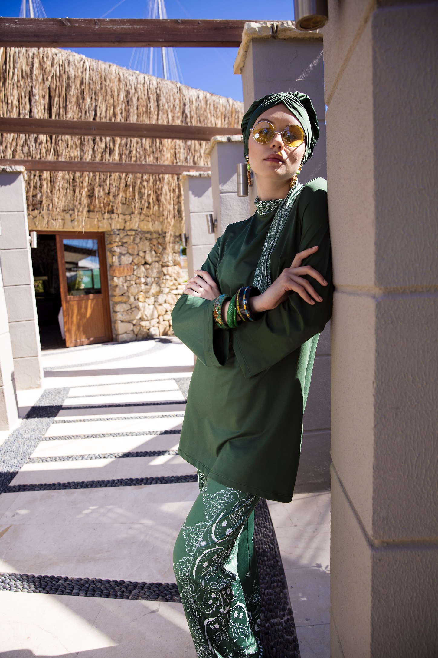 Mayovera green fully covered burkini forModanisa.com (Price: $99) comprising 5pieces: one colour top, patterned bottom,underwear, bonnet, & foulard. Chlorine andsaltwater resistant.
