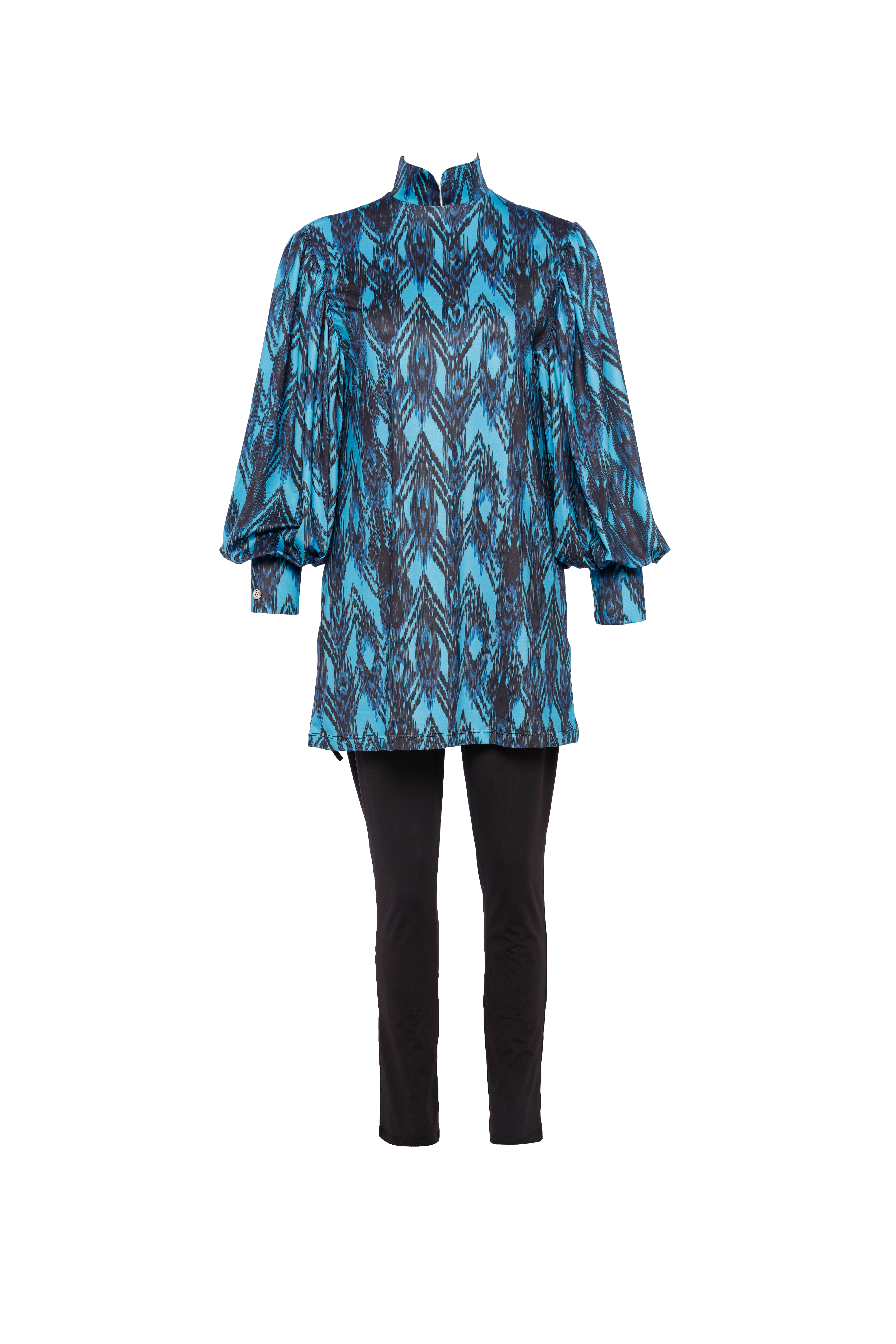 Mayovera turquoise with black & navy patterns burkini, unlined, fully covered with puff sleeves (Price: $119). The 5-piece bathing suit has a multi-colour top, black bottoms, bonnet, & two pieces of underwear, all with water-repellent finishing. Chlorine and saltwater resistant.