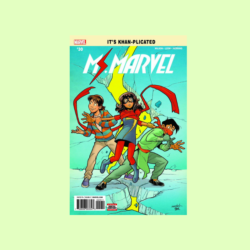 Ms. Marvel, by G. WIllow Wilson and Sana Amanat, is a wonderful comic book series about a Pakistani-American teenage Muslim girl who gets superpowers and has to learn how to be a superhero. It is a funny and relatable series for teen readers!
