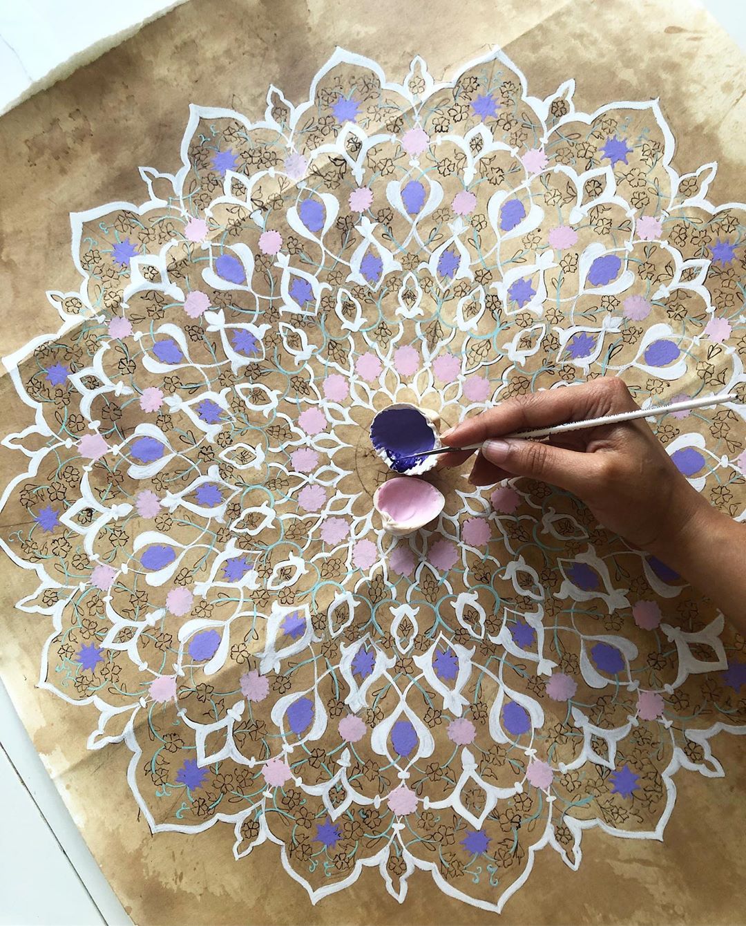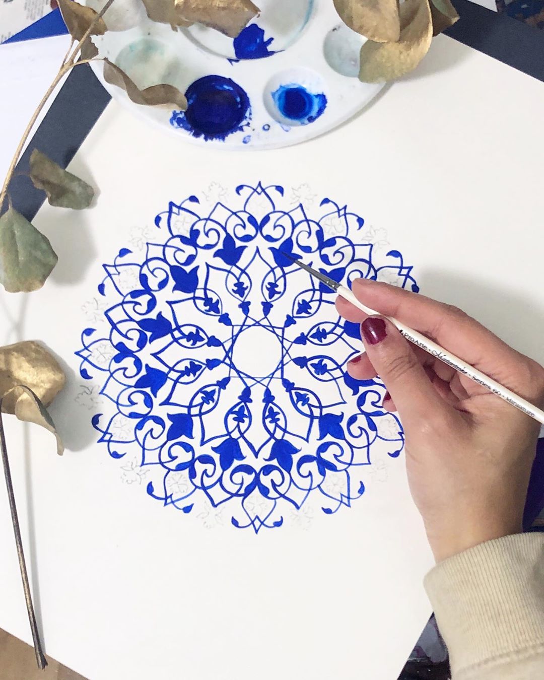 I really liked the circular (shamsa) patterns that are present in domes and ceilings. Two years ago I started taking those designs and translating it onto paper with my own understanding of shapes. I’m still playing with the idea today.