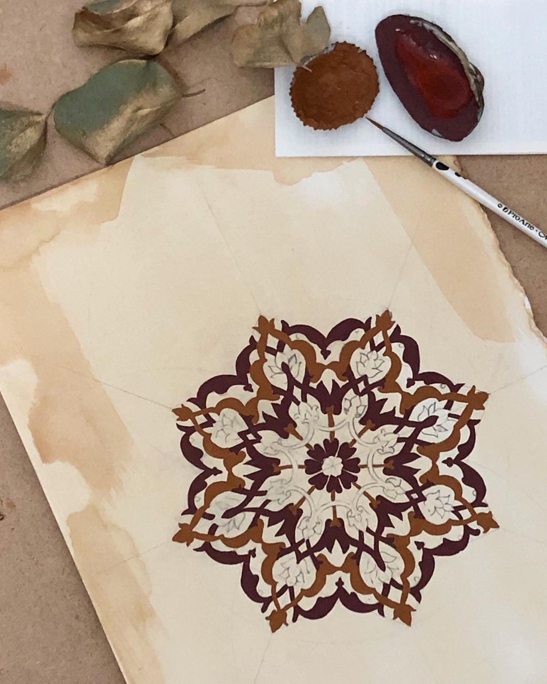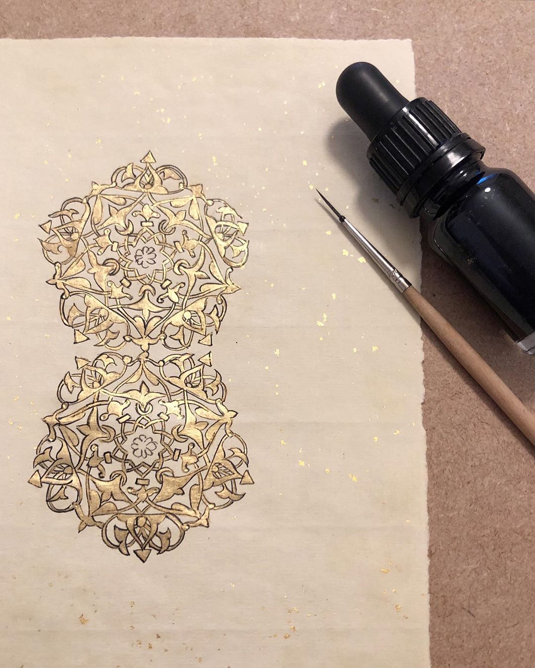 A lot of the artists have resources available. For example I have a resource page on my website Islamicillumination.com where I outline what books I recommend and what things I do. Its best not to message the artists directly on social media asking where to start, as many of us have already made the information readily available on our sites. However, do look at their projects and sign up to their courses. There’s Art of Islamic Pattern for geometry, which are held in London and abroad. Samira Mian also runs online and courses in London for geometry, and I run online and in-person courses on illumination.