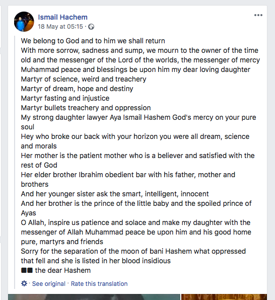 “My strong daughter lawyer Aya Ismail Hashem God’s mercy on your pure soul”.
