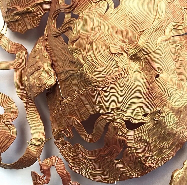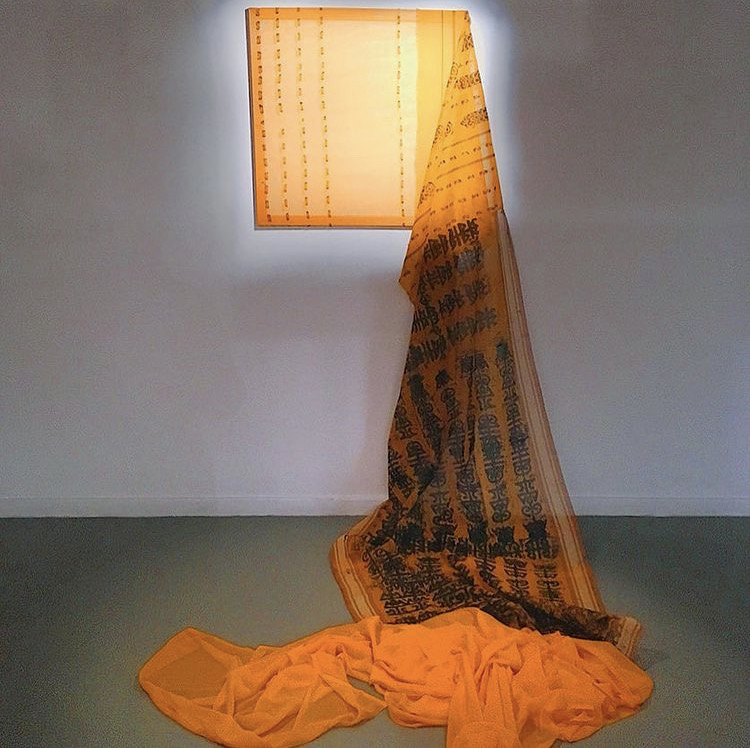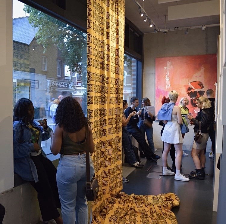 In 2018 and 2019 I worked on a series called ‘Saree Not Sorry’ which were in the mediums of painting, fabric printing, installation, and performance. This project was inspired by reflecting on the moment of when my mother drapes a saree on me and how the act made me want to unapologetically confess my secrets to my mother. It became a project which commented on the paradox of openness in private encounters. I also used Bangla text and pattern to extend these concepts. This series came to an end at the csm BA Fine Art final degree show. I am proud of this because the vulnerability I had in this project, making it, exhibiting it and sharing the concept with others allowed me to understand and connect with a lot of women (including my mother) in ways I would not have thought. It also helped me challenge myself as an artist in terms of scale and exposure.