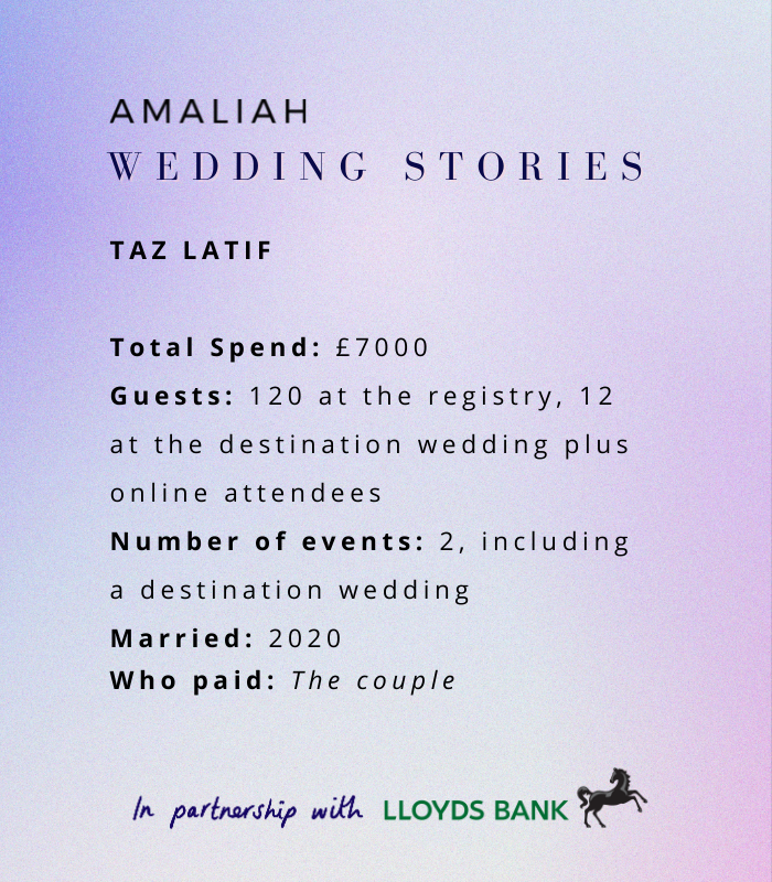 The couple planned a destination wedding to Turkey with a 50-person guest list and ended up spending £4000, including a personalised wedding planner (the best decision according to Taz), a seven-course meal, fresh flowers, cake and decor. With full control over the planning and budgeting, Taz and her husband arranged a wedding on the beach with the Imam and their friends and family on Zoom.