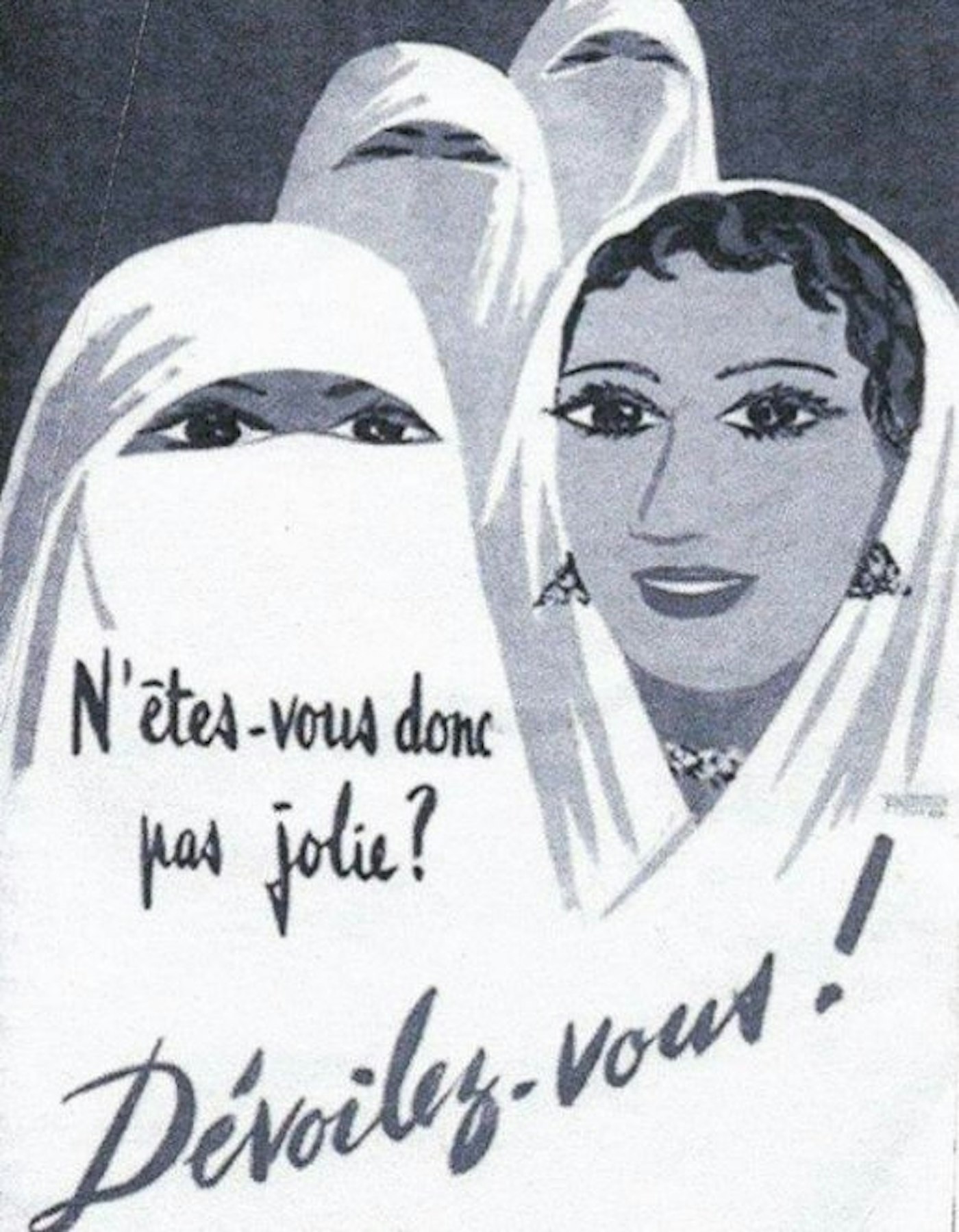 During the Algerian War of Independence in the 1950s, French propaganda sought to present an image of French-Algerian unity to the world. The army organised mass gatherings in front of international media, showcasing ‘reconciliation’ between the Muslim population and European settlers. As part of these gatherings, unveiling ceremonies were conducted to demonstrate the ‘success’ of the French colonial enterprise in ‘liberating’ Muslim women from the constraints of their religion and culture. In one such ceremony, a group of Algerian women burned their veils, while in another, European women unveiled their ‘sisters’ (9).