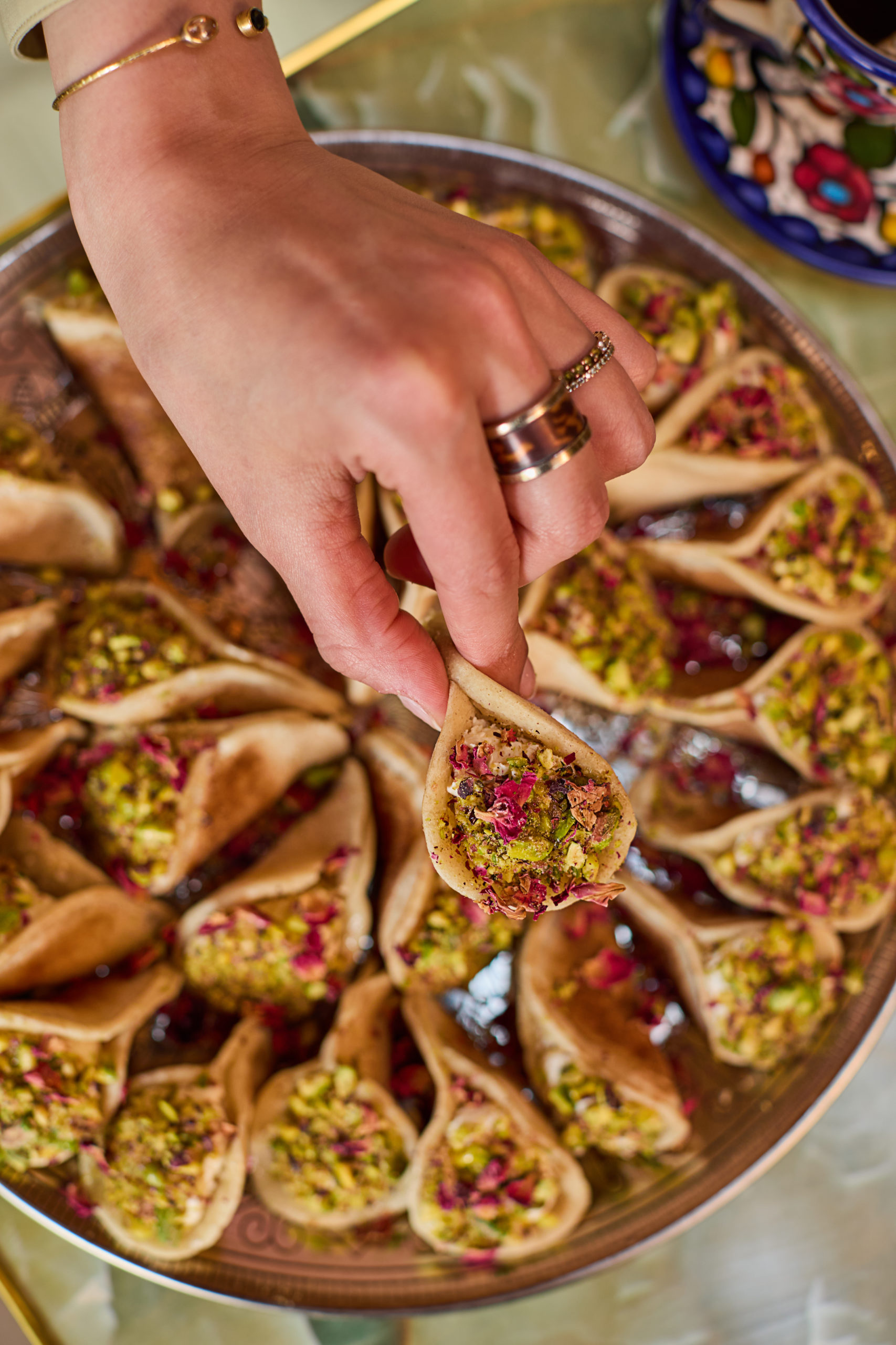 They’re a simplified version of traditional ‘Atayef’, a stuffed pancake that’s usually fried and dunked in syrup, usually eaten after breaking the fast, or for dessert and exclusively during the month of Ramadan. Asafeer, however, are the slightly easier, younger sibling of Atayef. They use the same batter but are half filled with cream, or Ashta (a clotted cream filling typically found in Arab desserts), dipped in crushed pistachios, and then drenched in rose water syrup.