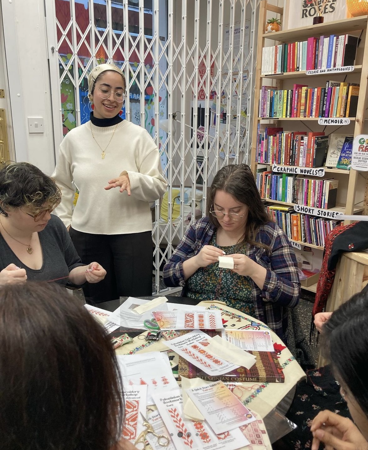 I’ve been reflecting on how I can create a positive impact for Palestinians from the outside. My father imports Palestinian products to the UK, which supports and empowers Palestinian farmers back home. I simply followed his footsteps by donating proceeds from my workshops to charity. So even though my financial impact is small, I believe our work will always be rooted in trying to help our communities back home. Additionally, through my workshops, I hope the influence of teaching people about our culture and history can be greater. Recently I’ve noticed an increased interest in the preservation of our culture in the form of resources, libraries and archives, which are needed to hold on to our culture, our values and our resistance against the ethnic cleansing that’s happening.