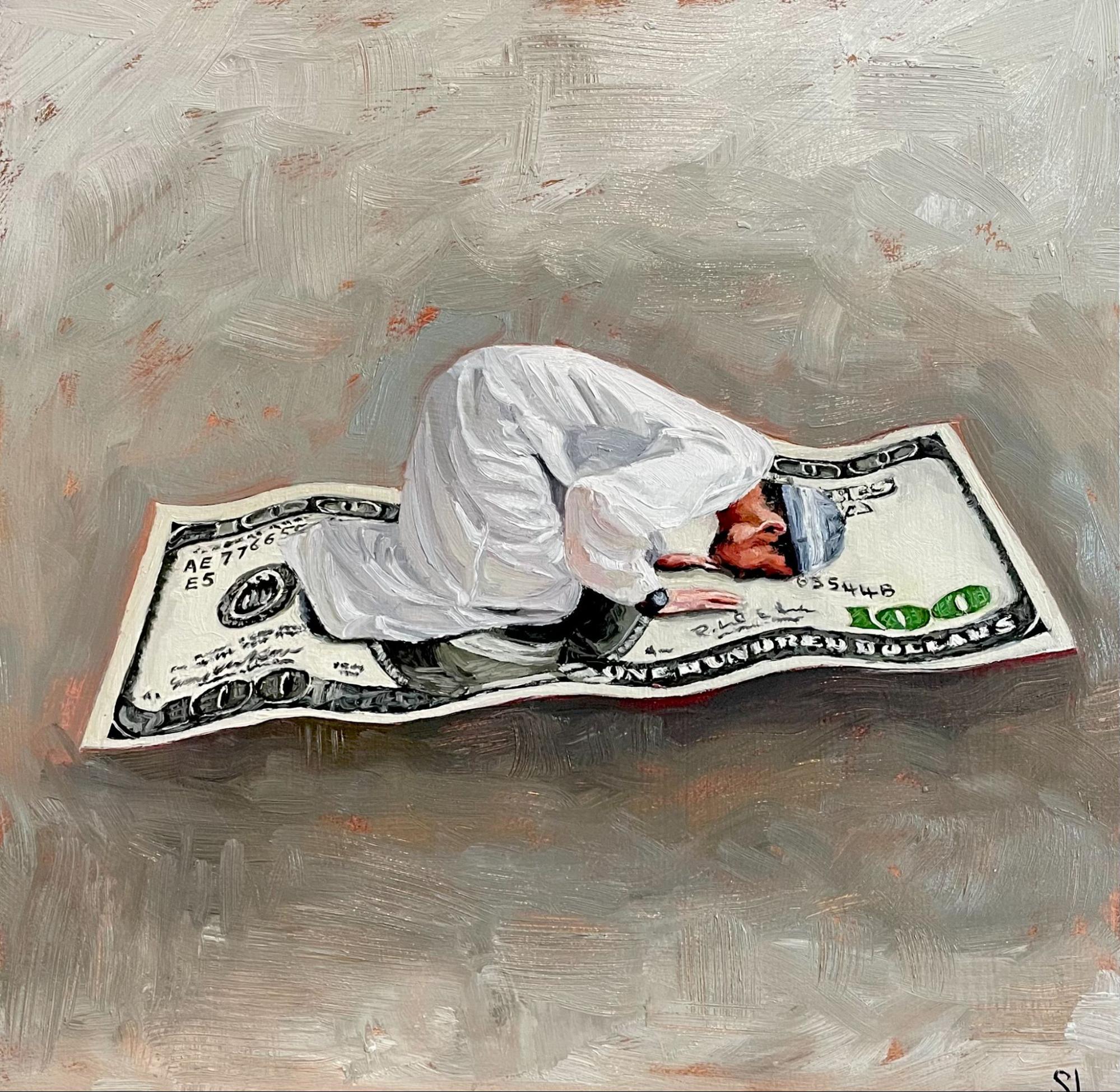 It’s called ‘Idolatry’ and it’s a figure of a Muslim man and he’s praying on a $100 bill. I remember the process as the image came to me when I was in the shower (if you have artist’s block, go take a hot shower). I knew I had to paint it, and the process of finding references, sketching and painting was easy. Sometimes, it’s a struggle, as you might have to start again, but I love how easy that one was.