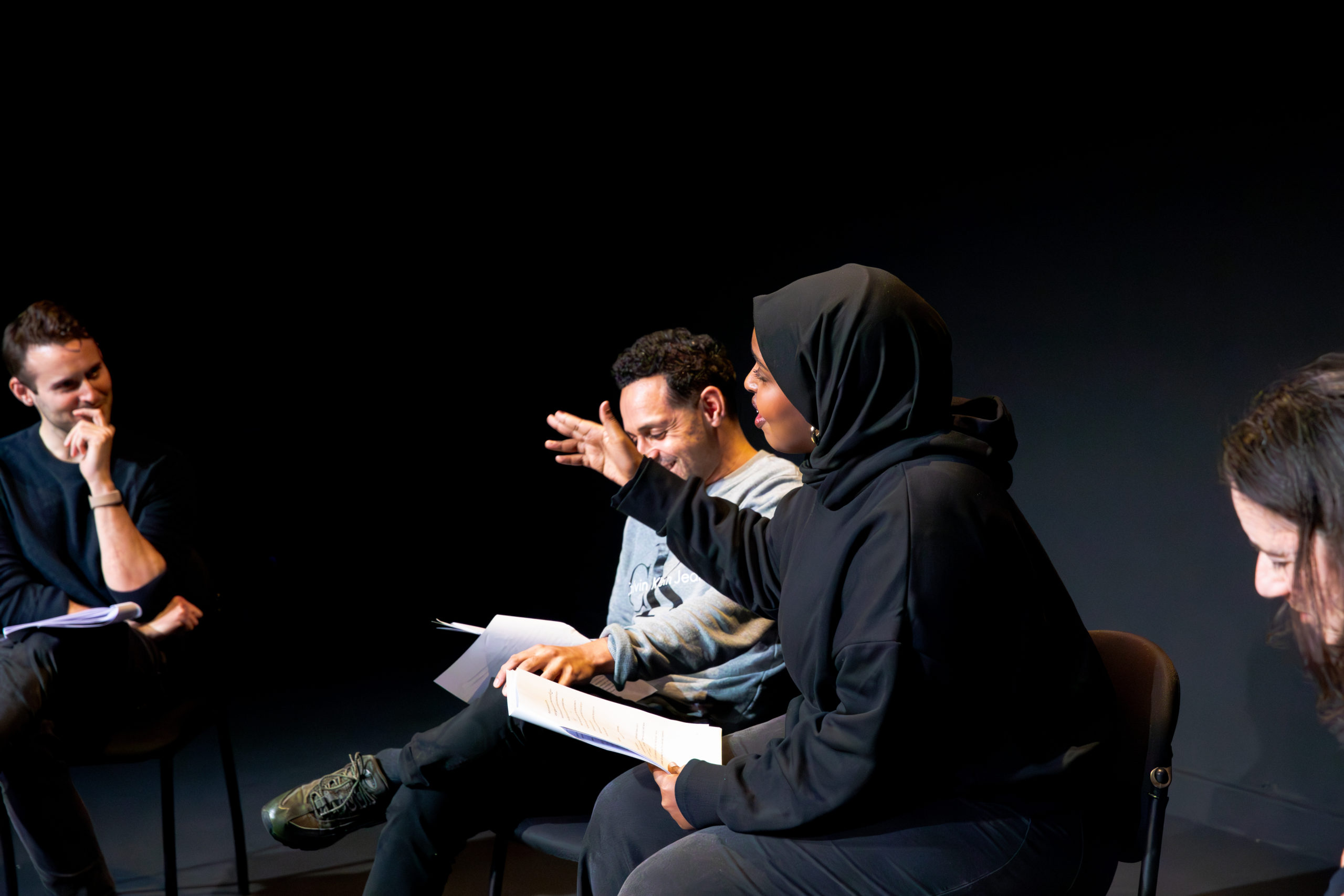 The group began as a way for us to connect with Muslim women from all walks of life and experiences. Some arrived with experience of stage work already, like Amal Abdi, whose one-woman show, Desperate Times, was first staged by Side eYe at Somali Week Festival 2023. Others brought experience from different corners of the theatre world, such as directing, producing or tangential industries like television. Some had already found their place in short story writing, cultural commentary and poetry, joining out of a growing curiosity about playwriting. What united them all was a shared commitment to crafting stories for the stage and a willingness to learn not only from our facilitators but from one another.