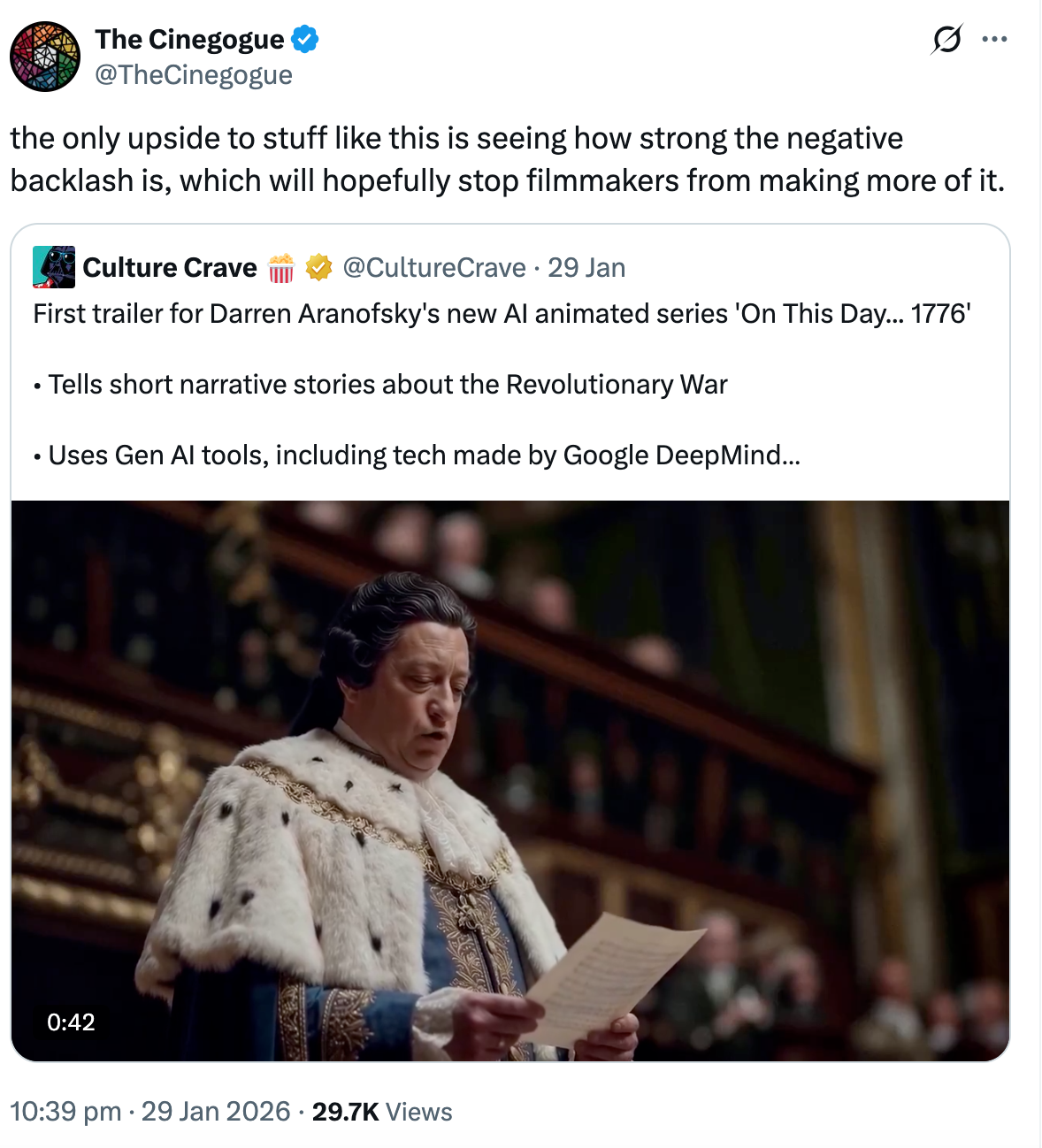 The pushback to the use of AI in film by audiences also makes it perfectly clear that the majority of people don’t want to watch AI-generated content either. @TheCinegogue summed it up perfectly on X,