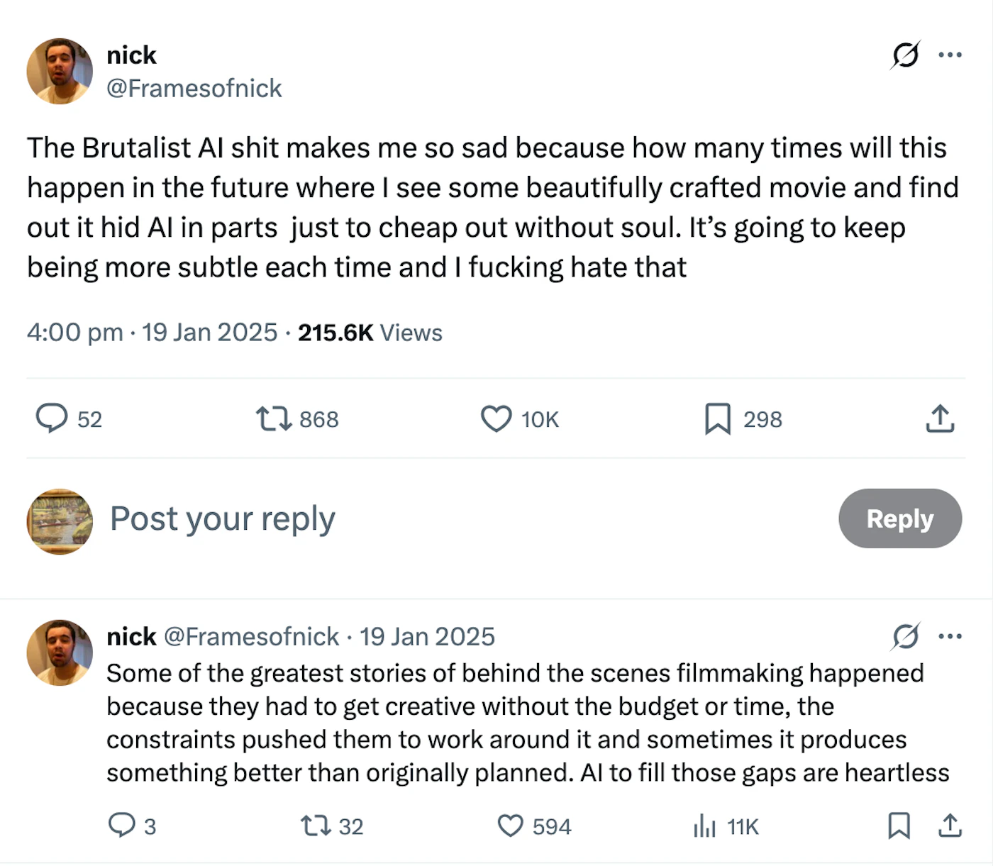 “Some of the greatest stories of behind-the-scenes filmmaking happened because they had to get creative without the budget or time… [using] AI to fill those gaps [is] heartless.”