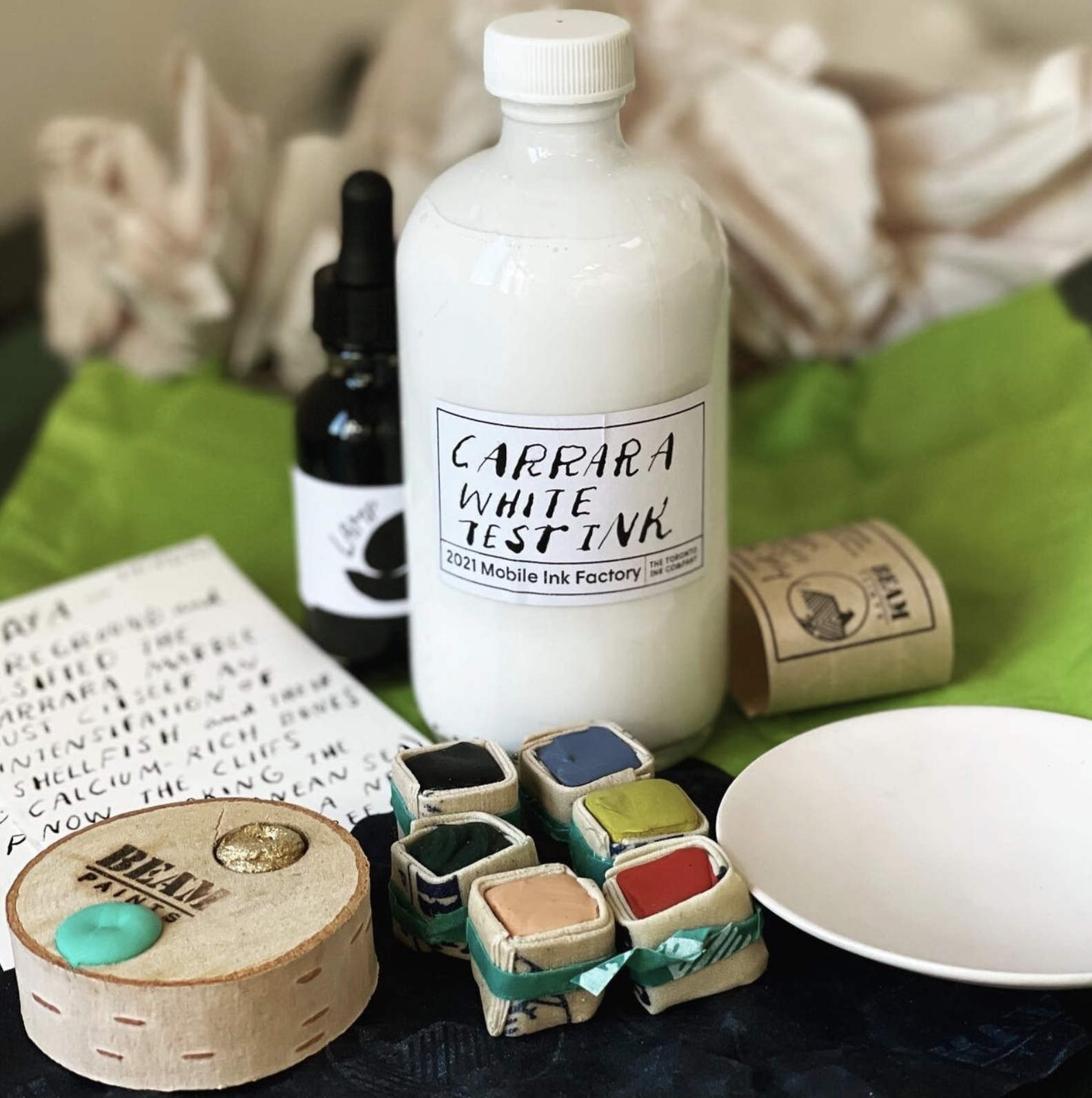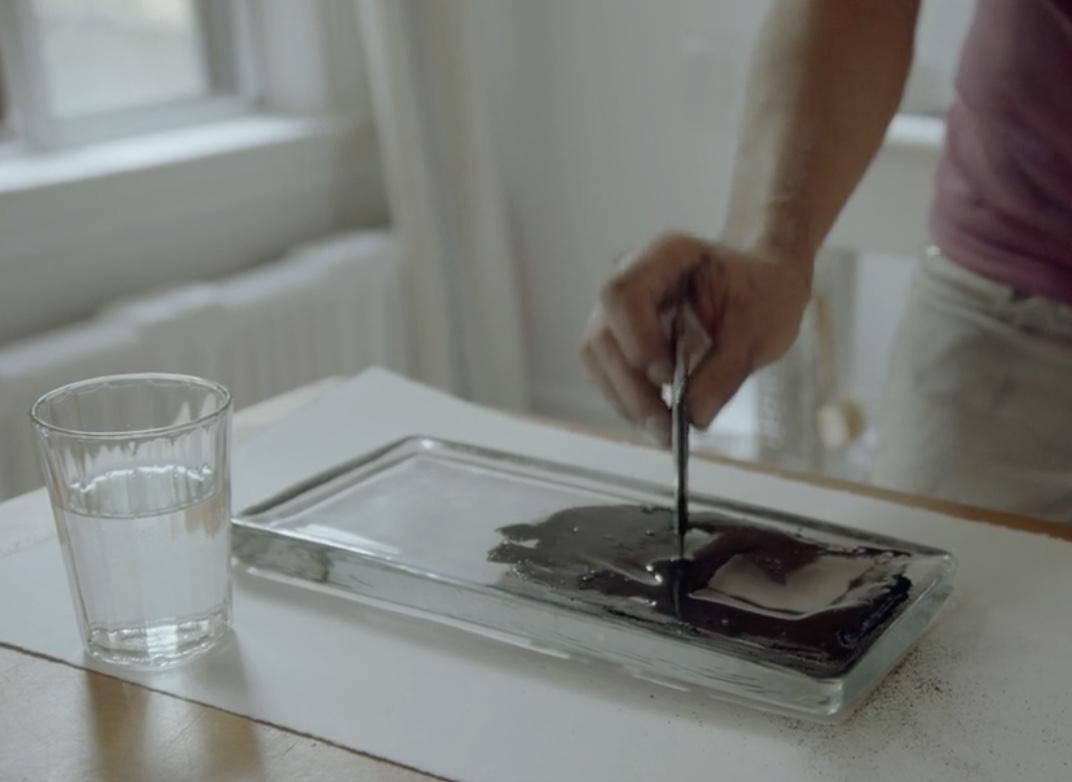 With an interest in the history of Rome, and through a collaboration with artist Marta Abbott, who also features in the film, Logan makes a unique white ink made from marble dust straight from Carrara, a town in northern Italy. Carrara marble is a metamorphic rock, quarried from the Apuan Alps. He sends the marble ink to Arabic calligrapher Soraya Syed, who creates a beautiful piece of artwork with it.